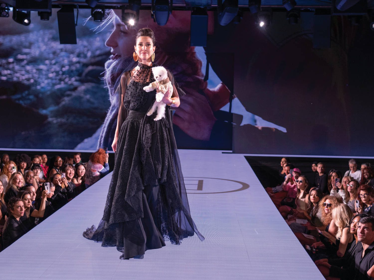 Models and pets strutted the runway in couture outfits that not only sparkled but symbolized meaningful causes, from animal welfare to women’s empowerment. ELSYIAN Founder and Publisher Karen Floyd said as she welcomed a packed Sony Hall, “Ripples create waves, and waves create change.”