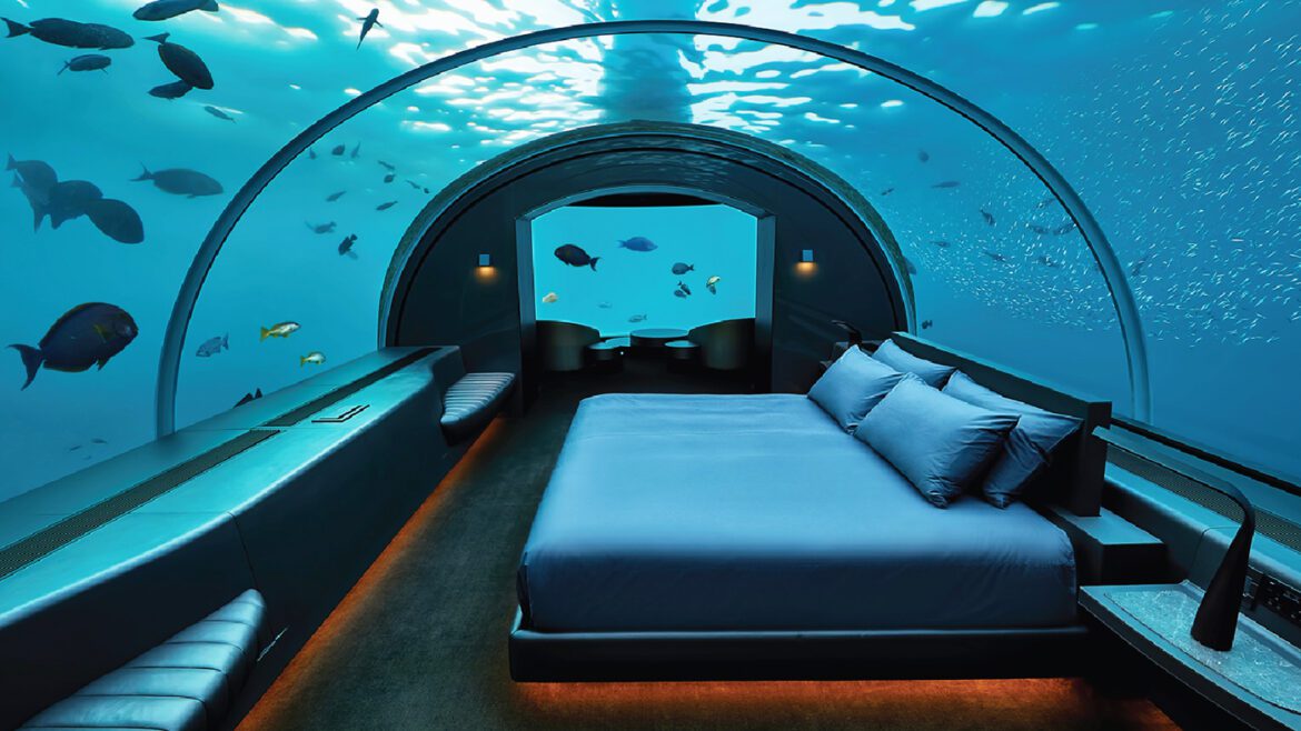 The Muraka’s design is an architectural marvel, blending advanced engineering with breathtaking aesthetics. The villa consists of two levels: the upper floor serves as the main living area, featuring a lounge, dining space, and terrace, while the lower floor, fully submerged, houses the master bedroom and an intimate lounge. Guests descend to the underwater level via a private staircase within the villa itself, making the transition from land to ocean seamless and thrilling. The floor-to-ceiling glass walls bring the vibrant marine life into full view, offering the surreal sensation of floating among tropical fish, manta rays, and reef sharks from the comfort of your bed.