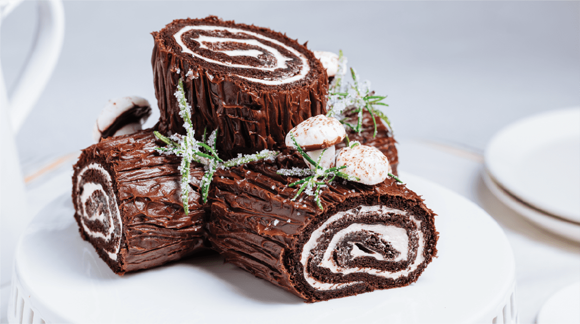 Enjoy this delightful and impressive Bûche de Noël as the centerpiece of your holiday dessert table!
