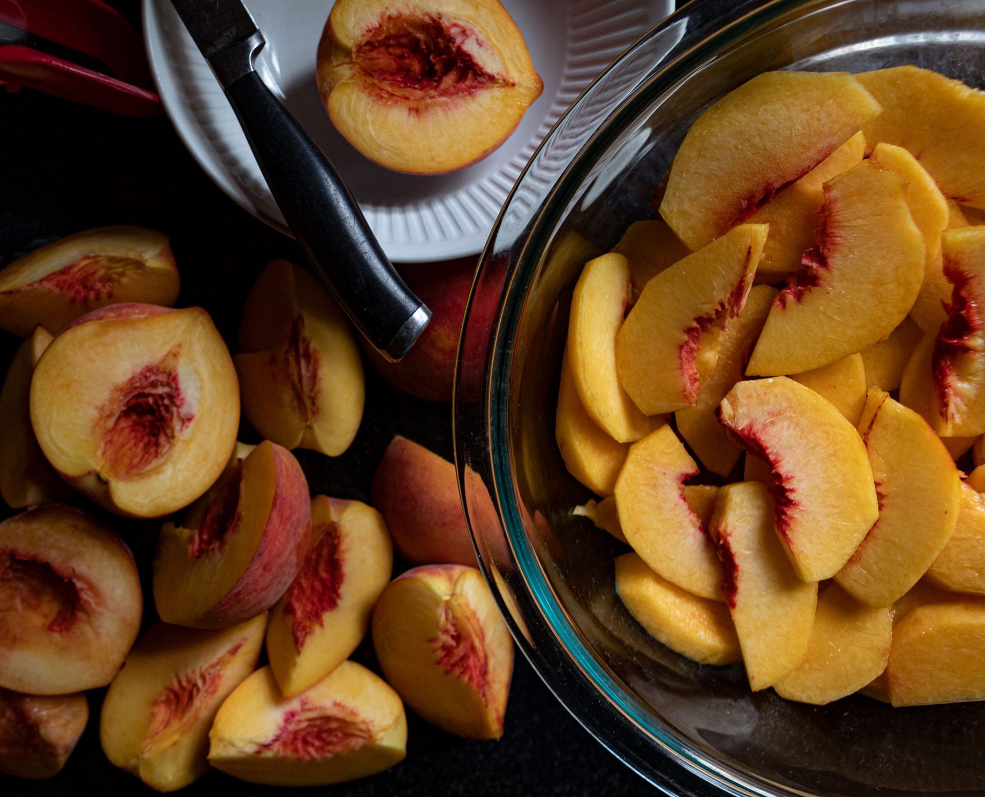 - 7 ripe peaches, peeled, pitted, cut into quarters and thinly sliced (Note: broken and less perfect slices will go on the bottom of the pie)