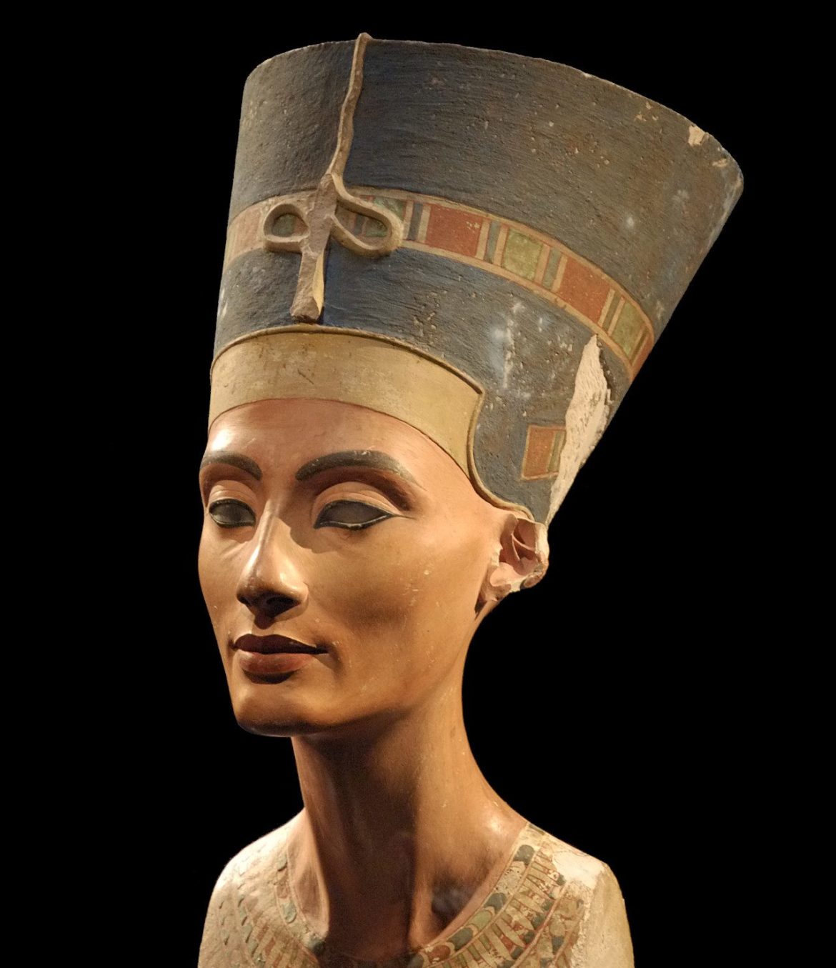 Galena mesdemet, a mixture of copper and lead ore, and a paste made from grinding pieces of the semi-precious stone, malachite, and copper with a mortar and pestle for eyeshadow. The exaggerated almond-shaped outline of the eye was kohl made from a mixture of burnt almonds, oxidized copper, animal fat, ash—and lead, which, with prolonged exposure, modern science reveals is deadly.