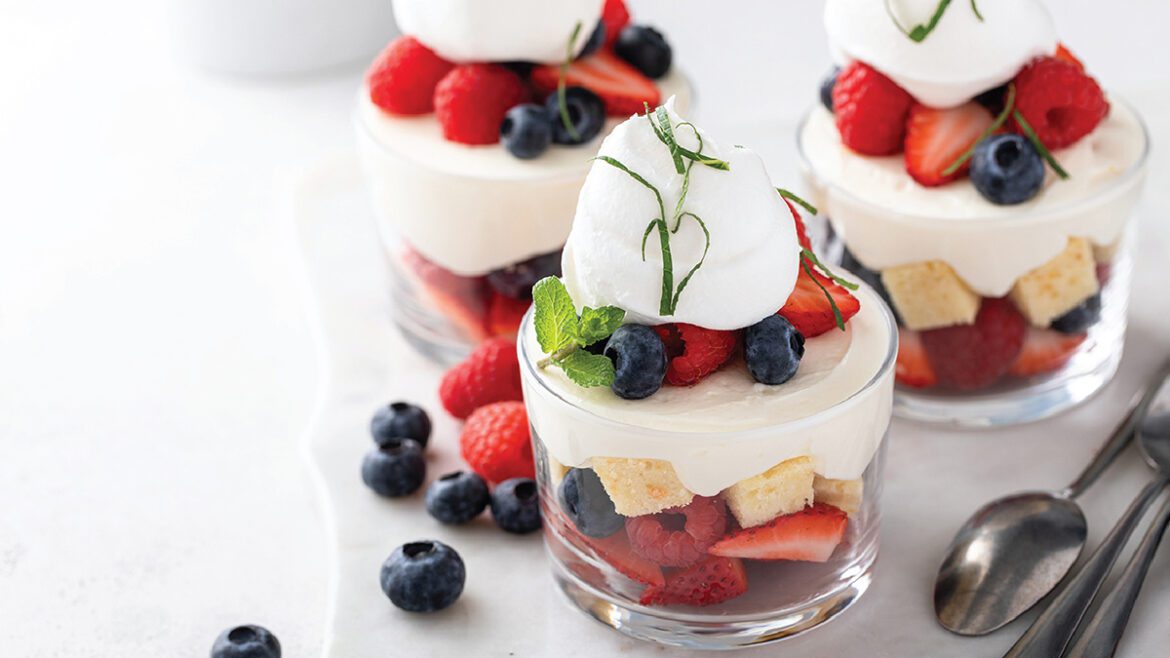 Layer cake pieces, then berries, then a dollop of whipped cream and repeat layers until cups are filled.