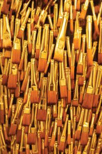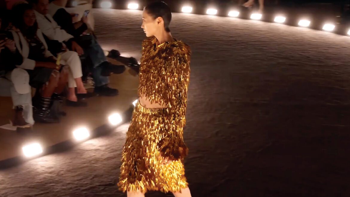 Among the evening’s most unforgettable creations was a sculptural dress constructed from approximately 6,000 paintbrushes, transforming a tool of artistic expression into couture itself. The piece shimmered under the lights like a kinetic sculpture, its dense forest of bristles catching movement and shadow with each step. In a collection preoccupied with the tension between discipline and imagination, the dress functioned as both garment and manifesto: fashion not merely inspired by art, but built from it.