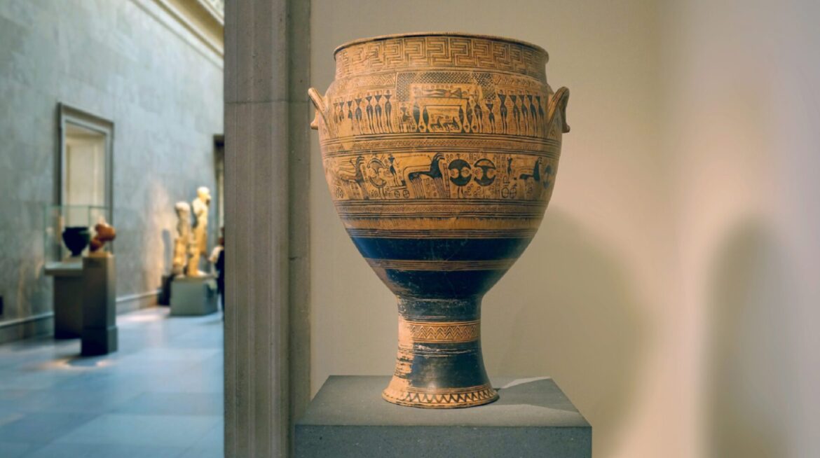 The famous Dipylon krater (c. 750 -735 B.C., The Metropolitan Museum of Art — featured above) found near the Dipylon gate in Athens bears witness to an age that saw man tackling formerly unfathomable concepts of mortality through the artistic depiction of ritualized burial parallel to its codification of societal order.
